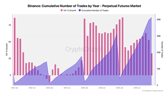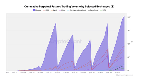 В то же время Binance продолжает лидировать по объемам торговли бессрочными фьючерсами: этот показатель вырос до рекордно высокого уровня в $24,6 трлн (для сравнения, в 2024 году было $21,2 трлн), что в 2,2 раза больше, чем у ближайшего конкурента OKX ($10,9 трлн).