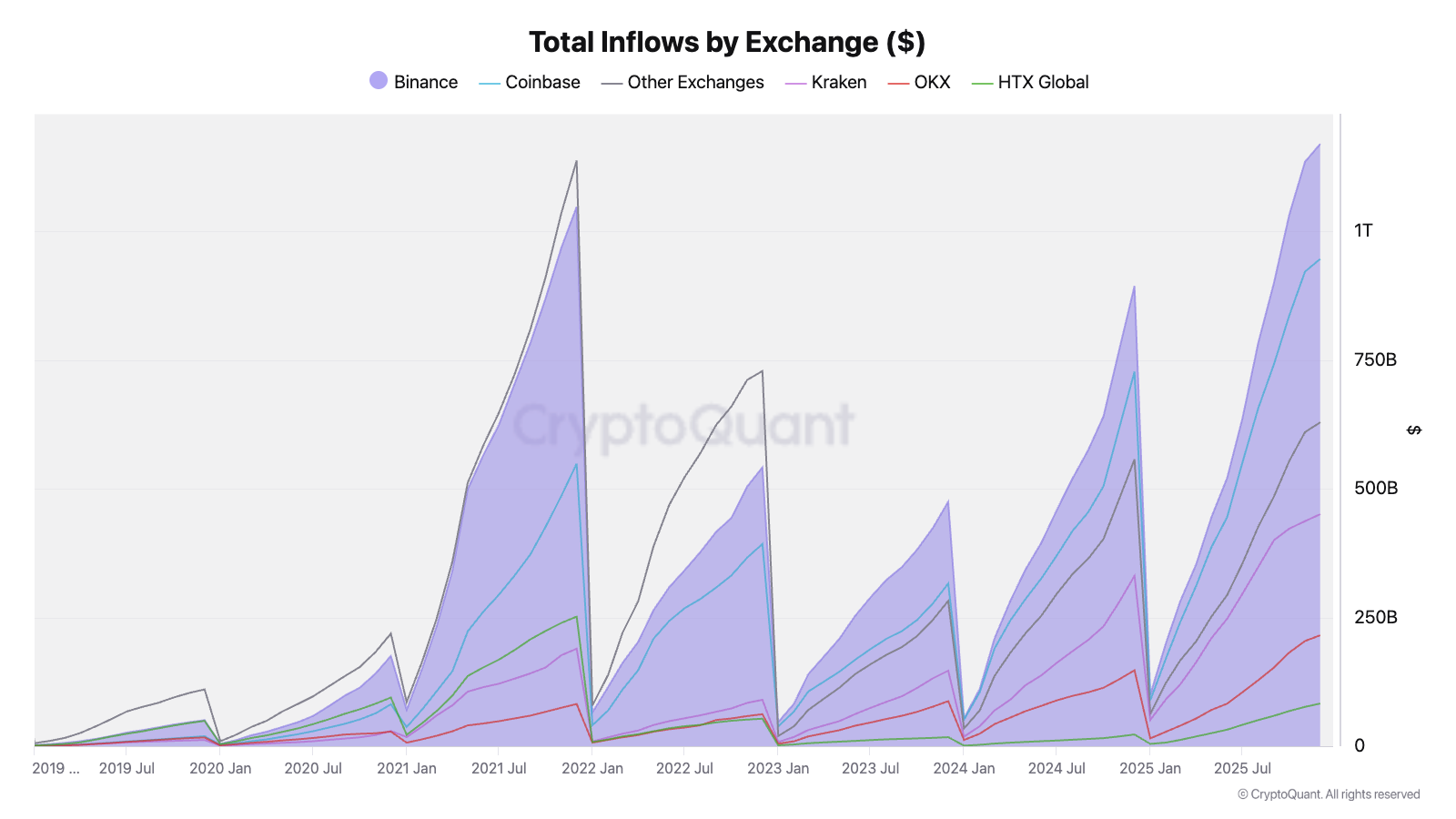 По данным аналитиков CryptoQuant, на текущий момент Binance лидирует по объему криптоактивов, поступающих на биржу, достигнув нового рекордного уровня в $1,17 трлн — рост на 31% в годовом исчислении, что значительно больше аналогичного значения ближайшего конкурента Coinbase ($946 млрд).