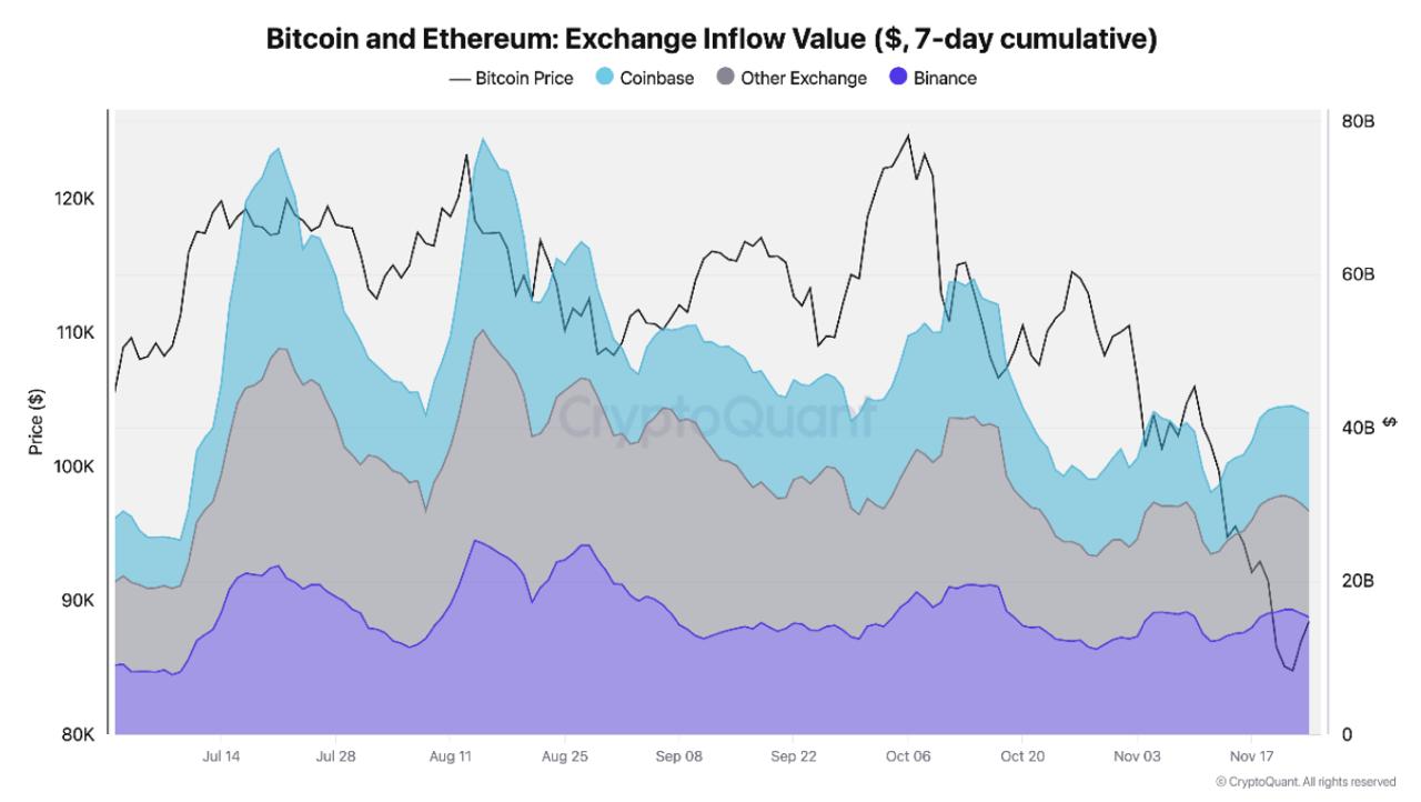 Параллельно на Binance приходится треть от общего потока капитала BTC и ETH — несмотря на глобальное падение курсов, объемы биткоинов и эфиров, поступающих на биржи, увеличились до $40 млрд, при этом показатели Binance достигли $15 млрд, опередив Coinbase на $11 млрд. Это главный показатель укрепления доверия со стороны институциональных и розничных пользователей, благодаря крупным ликвидным активам, проходящим через Binance.