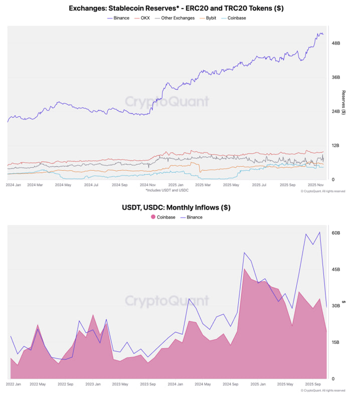 Так, резервы стейблкоинов Binance на этой неделе достигли рекордных $51,1 млрд — исторический максимум. Это почти на $10 млрд больше, чем у ближайшего преследователя OKX. В октябре Binance привлекли свыше $60 млрд притока стейблкоинов, существенно превысив аналогичное значение Coinbase ($33 млрд). Этот импульс продолжился в ноябре: $29 млрд в USDT и USDC по сравнению с $19 млрд у Coinbase.