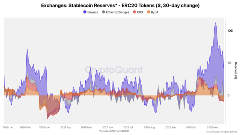 Параллельно на Binance наблюдался самый большой рост резервов стейблкоинов за последний месяц: 5 ноября 30-дневный прирост достиг максимума в $8,9 млрд — самый большой приток в 2025 году. Для сравнения, другие биржи, такие как Bybit и OKX, продемонстрировали гораздо меньший рост, что подчеркивает высокую ликвидность Binance во время текущей коррекции рынка.