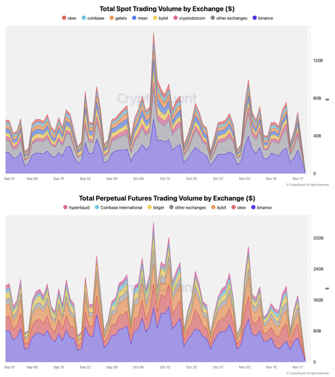 По данным CryptoQuant, несмотря на продолжающуюся коррекцию крипторынка, когда объем спотовых торгов снизился до $65 млрд, а объем фьючерсных торгов до $170 млрд, Binance сохраняет лидерство со спот объемом $25 млрд и фьючерсным объемом $62 млрд, что в разы больше аналогичных показателей других крупных централизованных бирж.