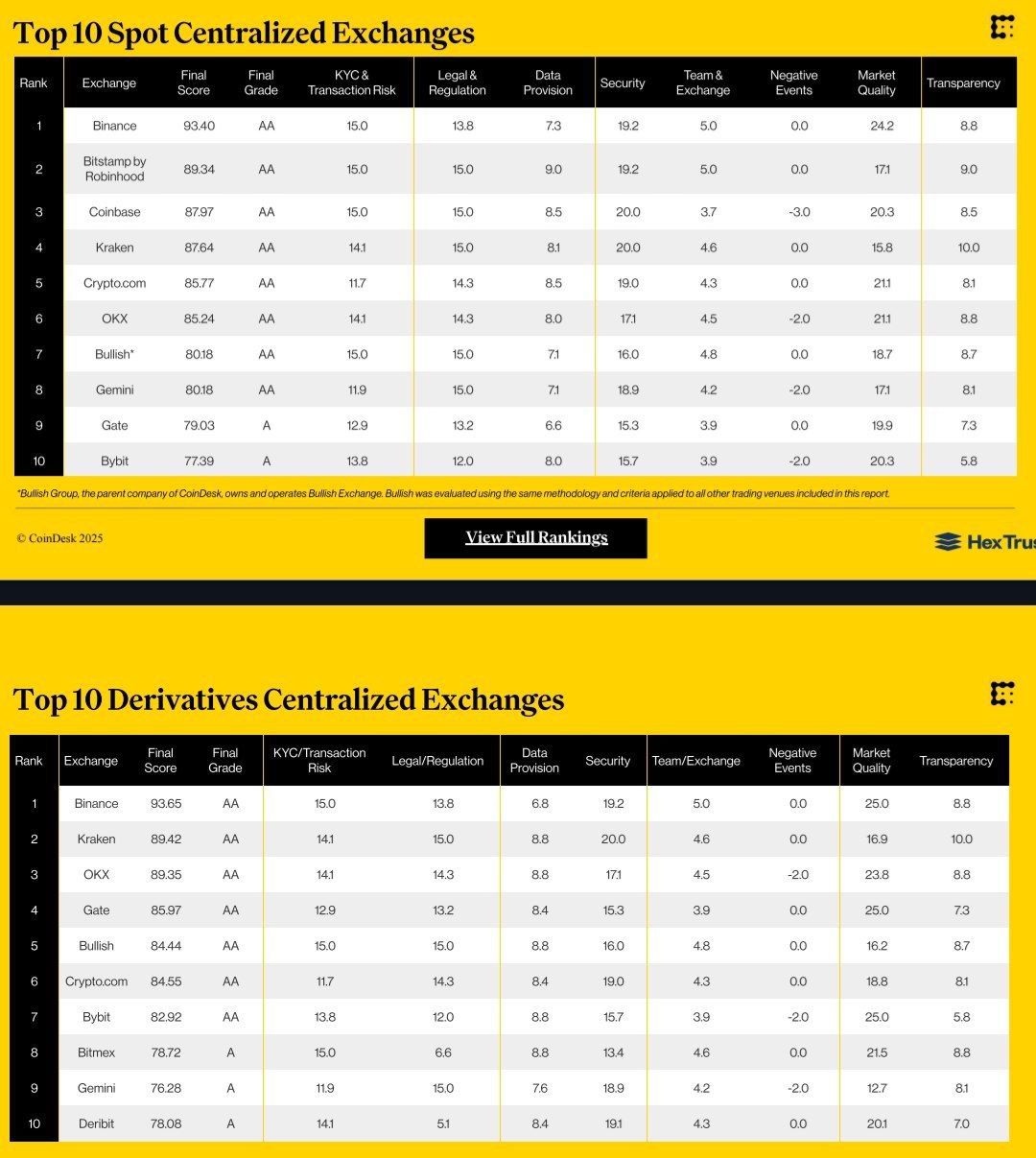CoinDesk опубликовал свой ежегодный Exchange Benchmark 2025, в котором Binance стала единственной в мире CEX, набравшей выше 90 баллов как в споте, так и в деривативах.