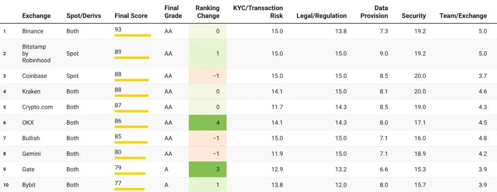 Определенно увеличивается конкуренция в «добросовестности и порядочности» среди CEX — число бирж с рейтингом AA удвоились с 4 до 8 с прошлого года, а показатели безопасности, прозрачности и соответствия требованиям растут в геометрической прогрессии из года в год.