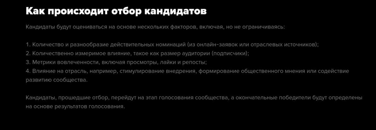 Каждый может номинироваться сам или номинировать своих любимых авторов и инфлюенсеров, после чего по итогам голосования будет составлен «шорт-лист» с самыми достойными и интересными лидерами мнений, которые действительно способствуют истинному развитию блокчейн-отрасли.