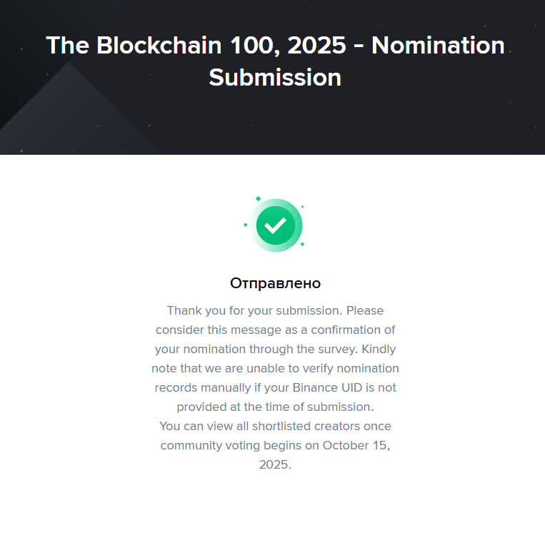 Выдвигать или выдвигаться можно на официальной странице Blockchain 100 до 12 октября 2025 года. Затем начнется открытое голосование с 15 по 26 октября. Объявление победителей состоится 3 ноября, а церемония награждения пройдет 3 декабря 2025 года.