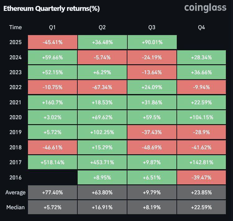 В общем и целом же, ETH определенно показывает выдающиеся результаты, несмотря на текущую коррекцию — вторая крупнейшая по капитализации криптовалюта подорожала на 90% за два месяца третьего квартала 2025 года.