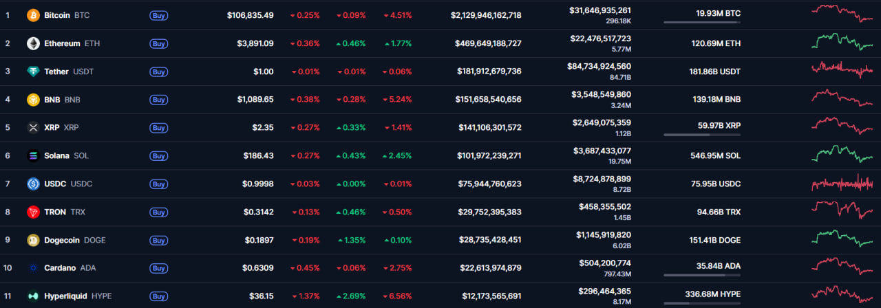 Однако избежать новых локальных минимумов все же не удалось — в моменте BTC свалился ниже $105 000, потянув за собой «на дно» крупнейшие по капитализации альткоины.
