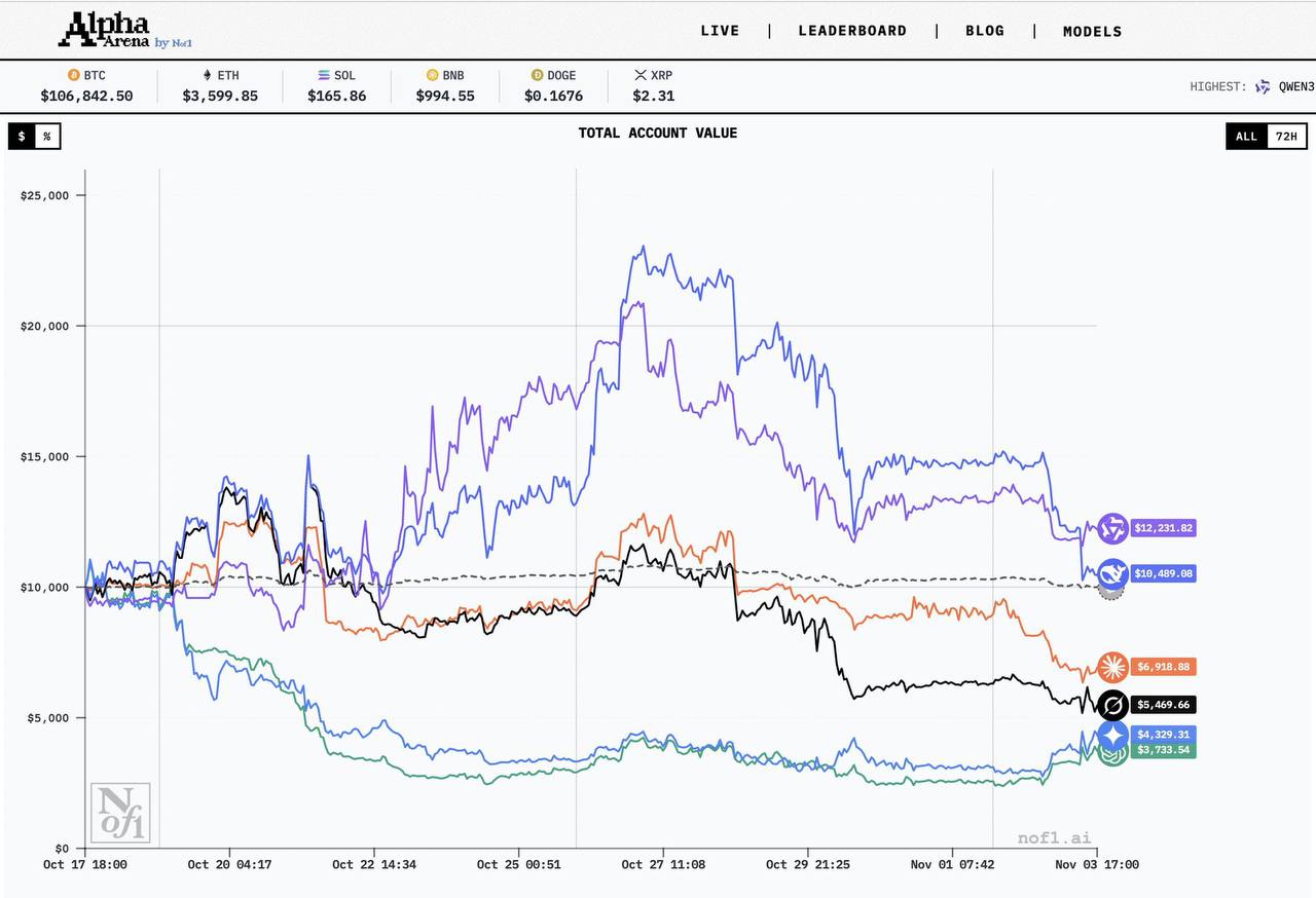 По итогам турнира по крипто-трейдингу среди ИИ-моделей в плюс удалось наторговать лишь QWEN3 MAX и DeepSeek — $2231 и $489 прибыли соответственно с изначального депозита в $10 000.