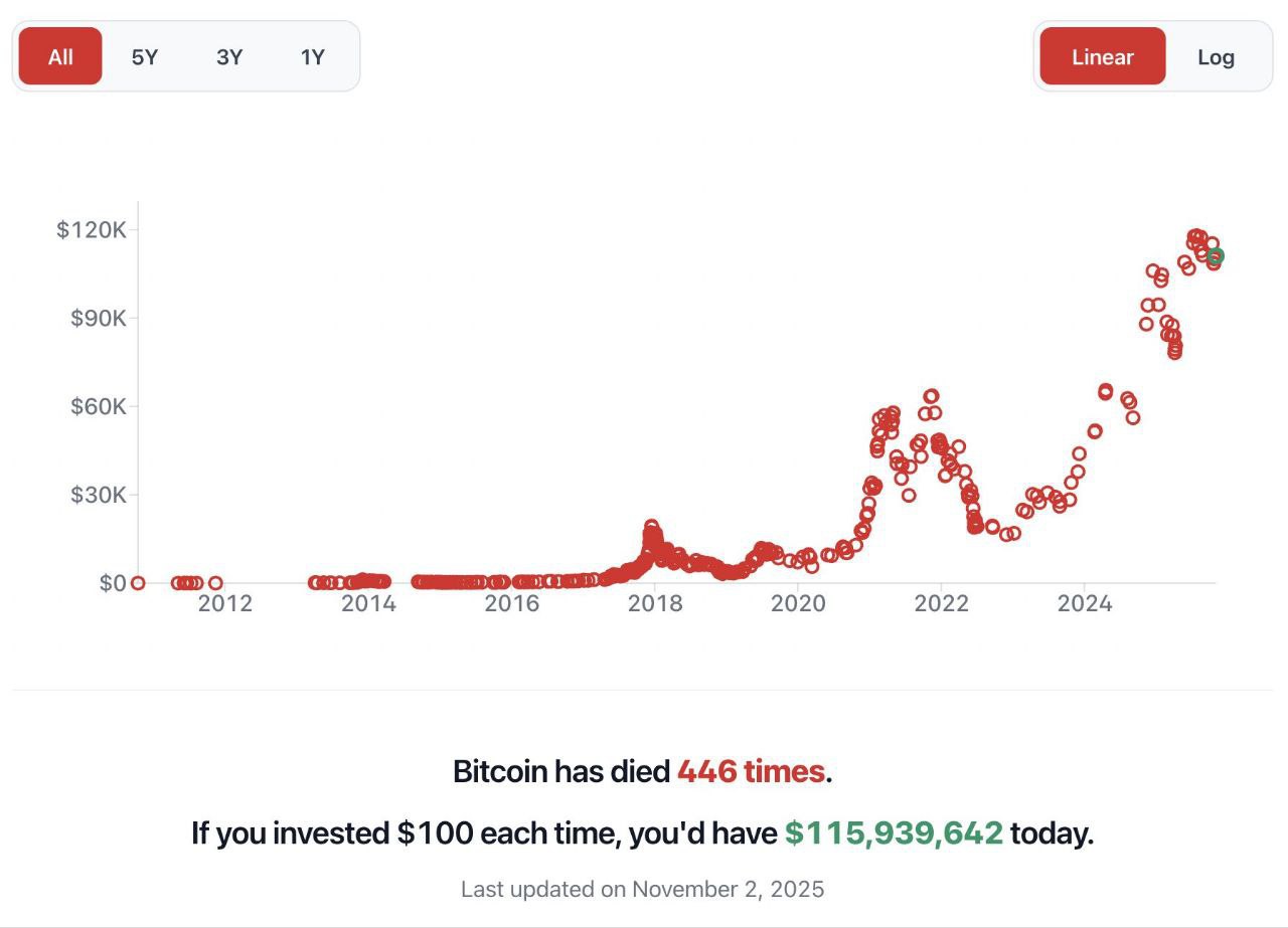 Многие «фиатные» аналитики уже успели объявить о «лопнувшем пузыре» Bitcoin, однако, не стоит забывать, что разного рода СМИ и «эксперты» уже 446 раз объявляли BTC мертвым — если бы вы покупали биткоин на $100 каждый раз, когда его «хоронили», то у вас прямо сейчас было бы $115 млн…