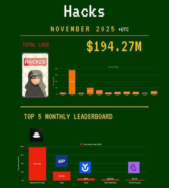 В целом же, в ноябре произошло 15 крупных крипто-взломов — похищено в совокупности $194 млн, что в 10 раз больше, чем в октябре.