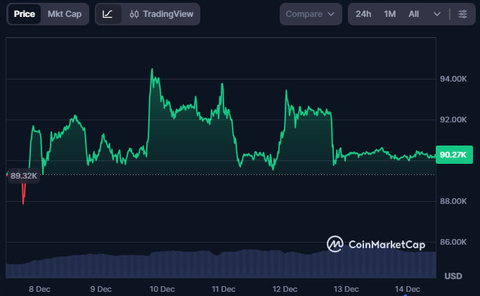 Биткоин на этой неделе вяло и «неволатильно» торговался в области $90 000 после недавнего сокрушительного снижения из зоны далеко выше $100 000 и ATH на отметках у $126 000.