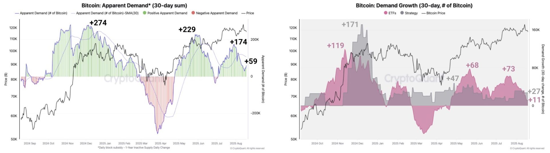 Параллельно CryptoQuant фиксируют серьезное падение спроса на биткоин — со 174 000 BTC в июле до 59 000 BTC в августе.