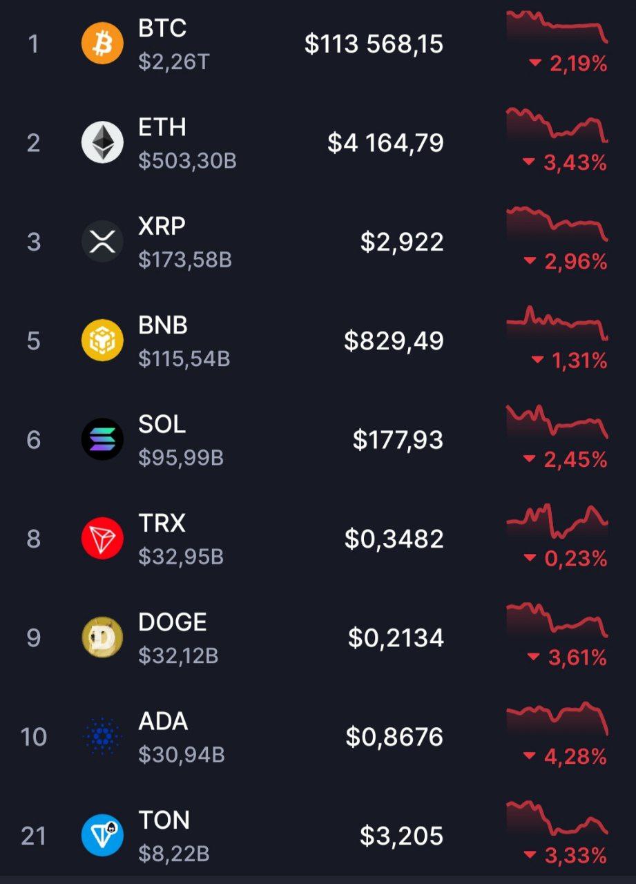 За последнюю неделю ажиотаж вокруг роста криптовалютного рынка сменился ожиданием окончания наступившей внезапно коррекции. Прямо сейчас биткоин упал ниже $115 000, а воспрявшие было на прошлой неделе альткоины поледовали его примеру и также торгуются в красной зоне.