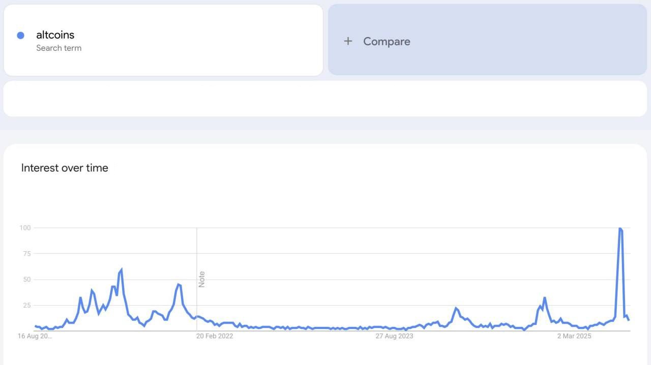 На этом фоне интерес пользователей Google к альткоинам вернулся к минимальным значениям, стремительно упав после всплеска во время недавнего роста ETH к $4800 и BNB к новым ATH.