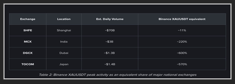 Спустя 90 дней после старта TradFI активов, торговые объемы по золоту на Binance выросли в 5000 раз — с $1,5 млн до $7,6 млрд в день. Это сопоставимо с показателями крупнейших мировых товарных площадок, согласно данным с официального сайта.