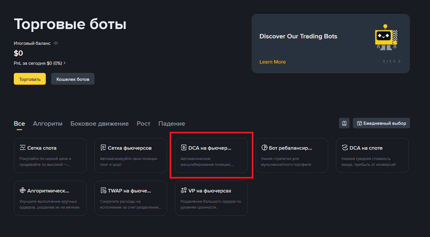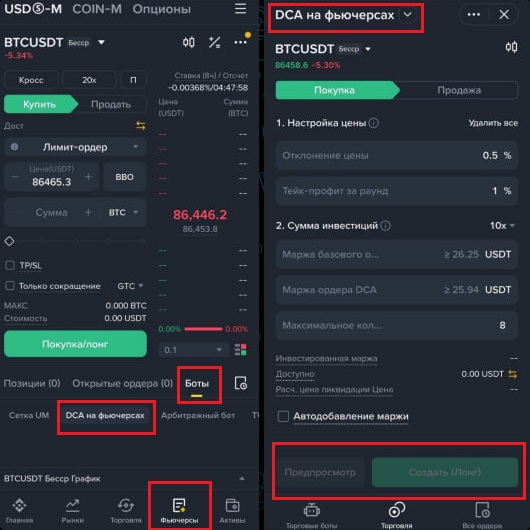 В мобильном приложении Binance необходимо перейти на вкладку «Фьючерсы», далее «Боты» > «DCA для фьючерсов».