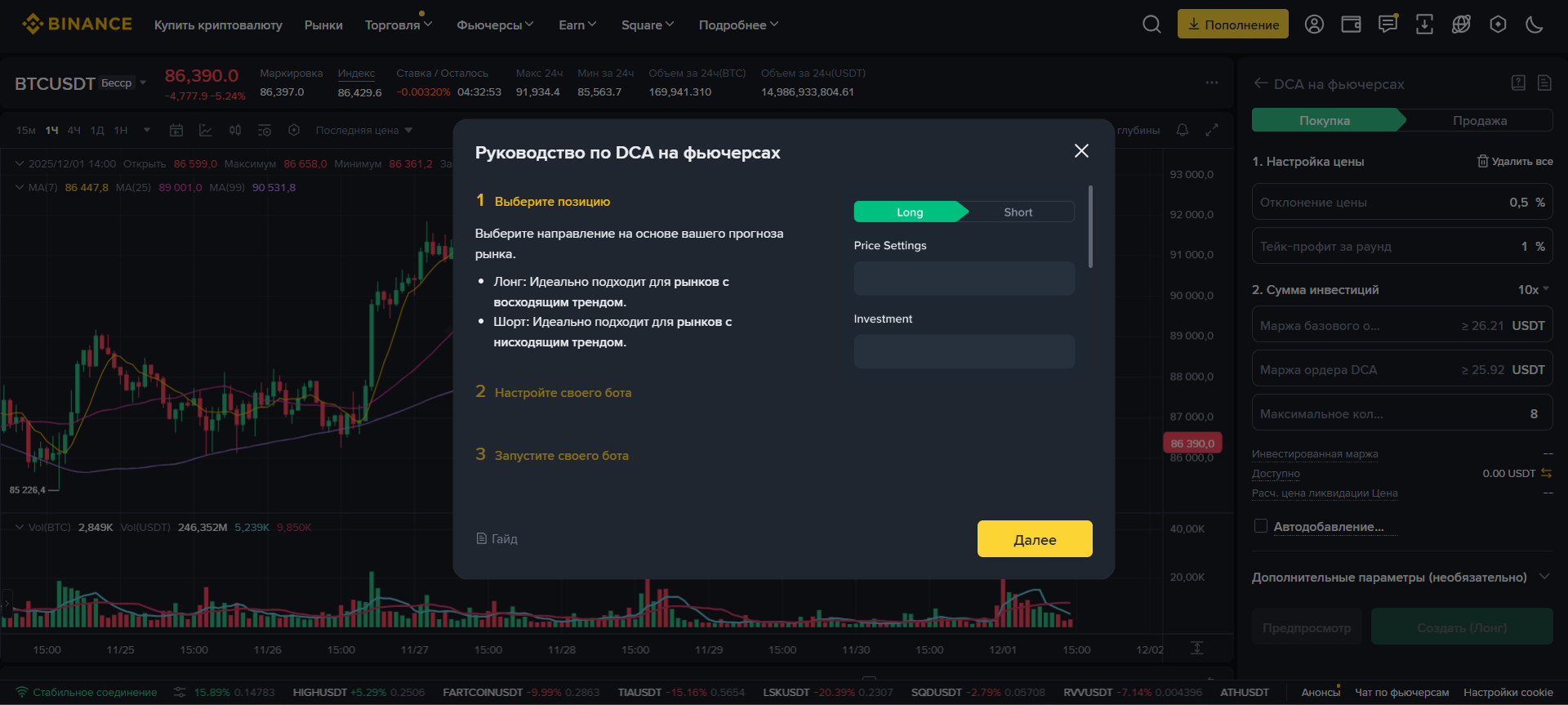 Для справки: бот DCA для фьючерсов — это инструмент автоматической торговли, реализующий стратегию усреднения долларовой стоимости. Он работает путем автоматического увеличения размера позиции пользователя при заранее установленных процентных изменениях рыночной цены. Этот подход направлен на достижение более выгодной средней цены входа, если рынок движется неблагоприятно после первоначальной сделки, а затем восстанавливается. Бот также включает функцию автоматического «тейк-профита» для закрытия позиций после достижения заранее определенной цели по прибыли.
