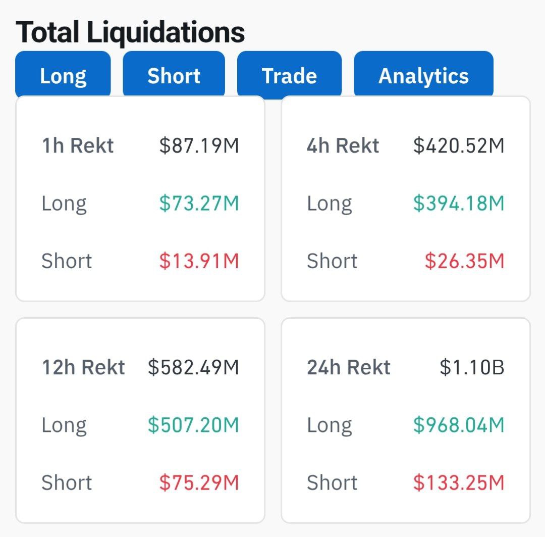 За последние 24 часа с криптовалютного рынка ликвидировано позиций трейдеров на $1,1 млрд — абсолютное большинство ликвидаций в LONG-сделках.