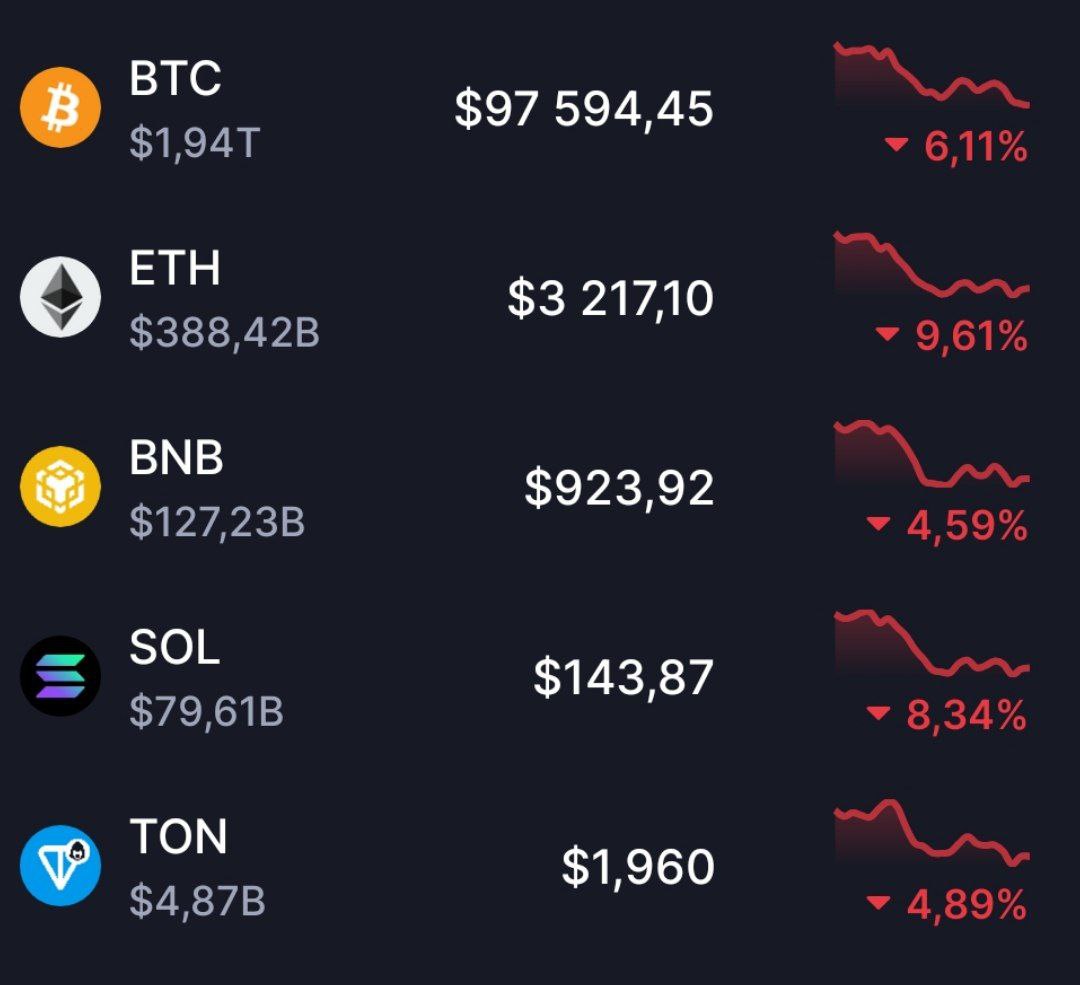 Bitcoin рухнул в область $96 000, потянув за собой вниз альткоины. Миллиард долларов ликвидаций за сутки.