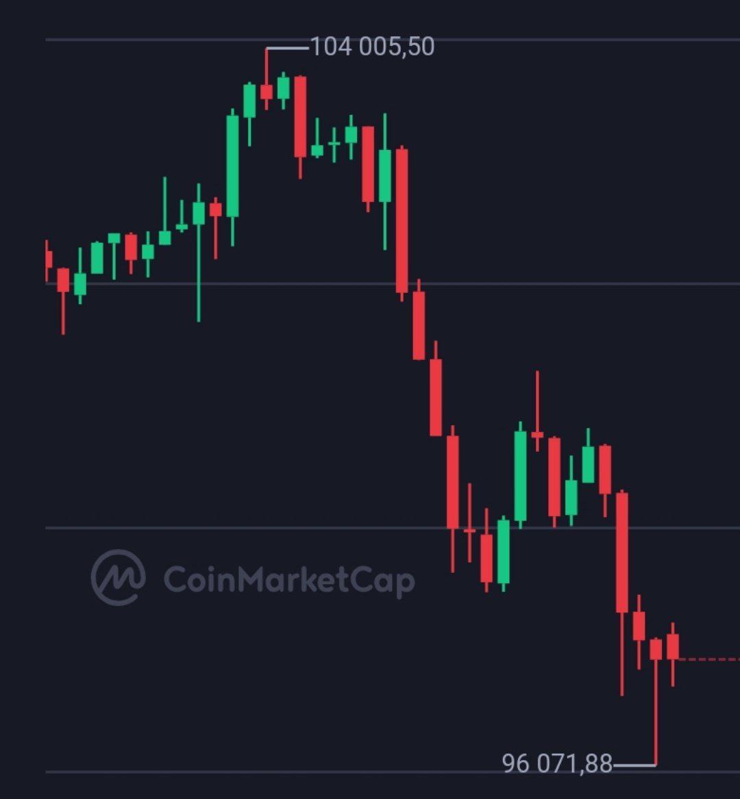 Биткоин снова упал ниже психологического уровня $100 000 после недавнего восстановления в область выше $105 000. В моменте ведущая криптовалюта «коснулась» локального дна в $96 000 прежде, чем «отскочить» в зону $97 000.