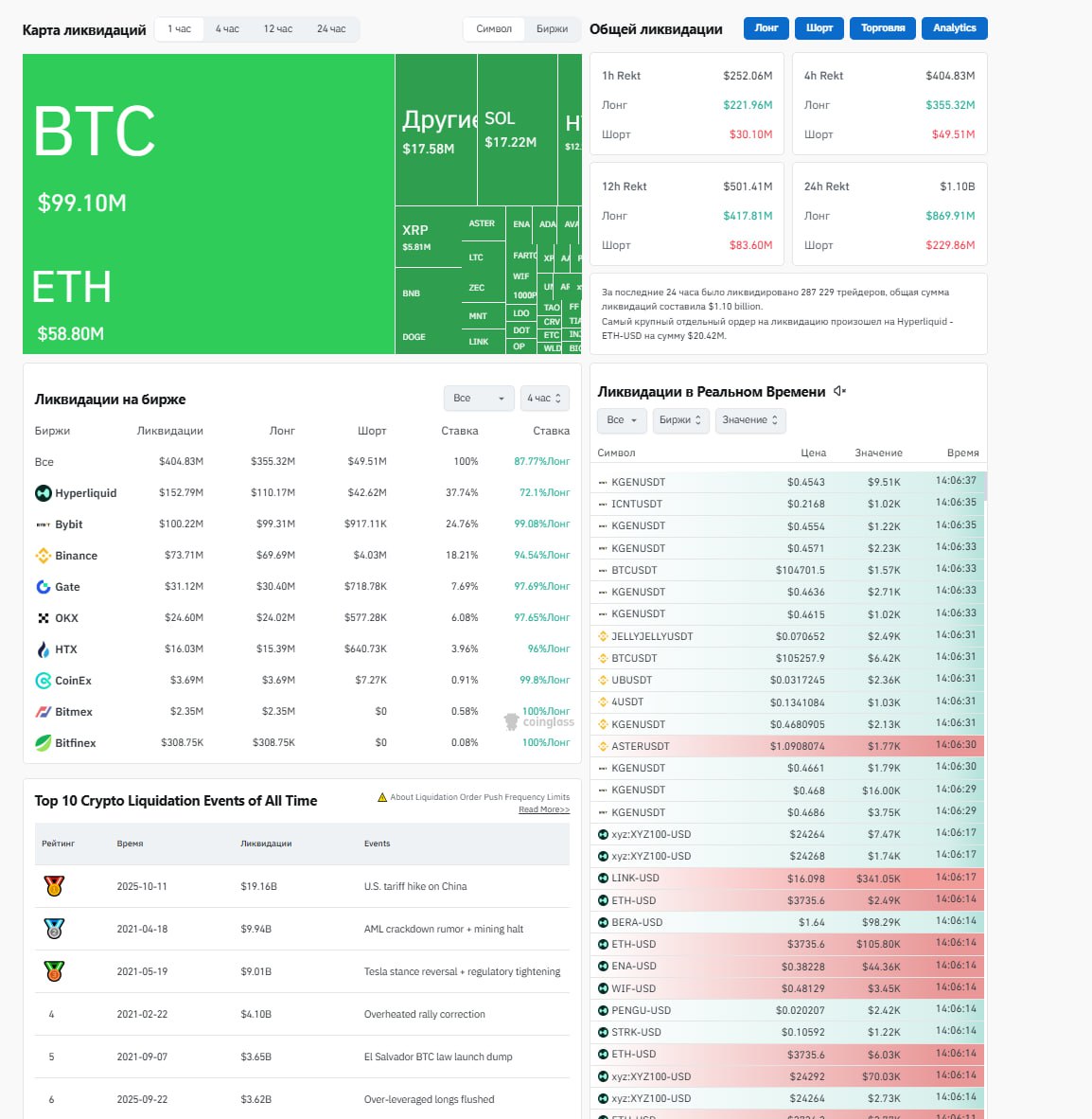 Только за последние сутки ликвидировано 287 229 трейдеров, а общая сумма ликвидаций превысила $1,1 млрд. Крупнейшая ликвидация случилась на Hyperliquid — ETH-USD на сумму $20,5 млн.