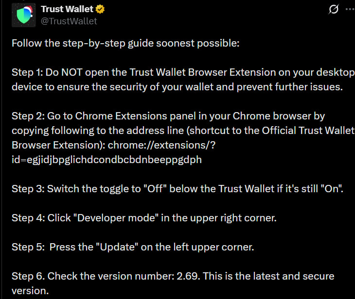 Пока браузерным расширением лучше не пользоваться, хоть и заявляется, что проблема лишь в версии 2.68. Trust Wallet опубликовали инструкцию по безопасному обновлению до 2.69.