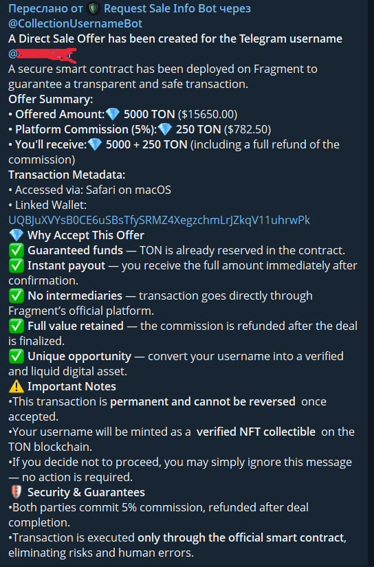 В конечном итоге он предлагал 5000 TON, но не через обычный аукцион Fragment, а через «прямой смарт-контракт» — левый бот с «волшебной кнопкой». Но тут мы решили все же не нажимать на эту кнопку и «открыть карты»:
