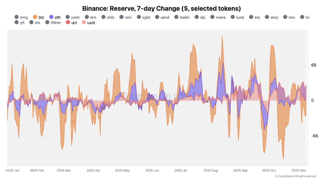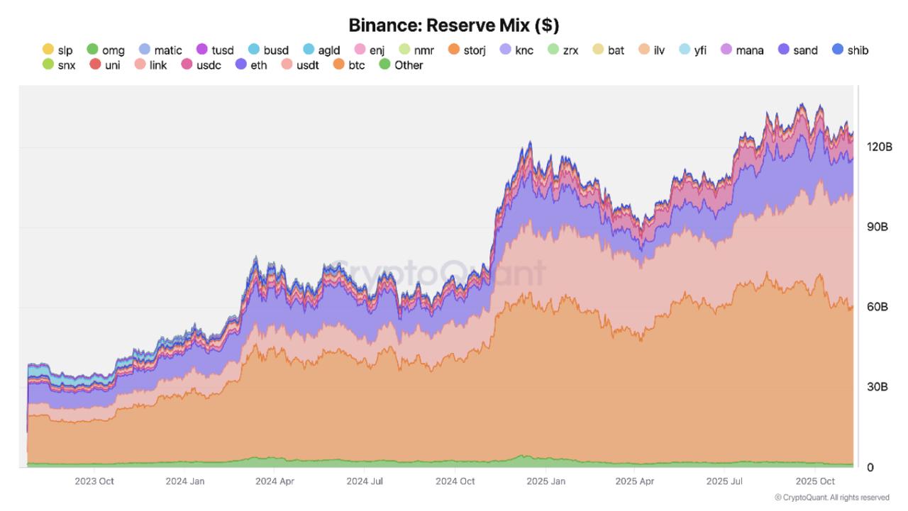 Совокупный объем резервов крупнейшей в мире криптовалютной биржи Binance остается на уровне около $120 млрд, несмотря на недавнюю мощную волатильность рынка, когда биткоин стремительно упал в область ниже $100 000, потянув за собой топовые альткоины.