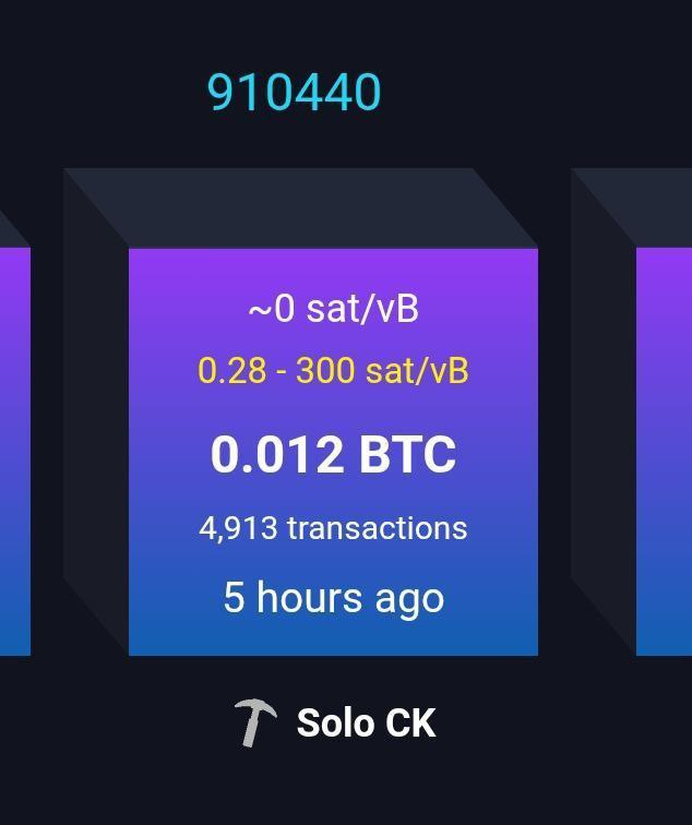 Соло-майнер на этих выходных успешно добыл блок 910440 в сети Bitcoin, единолично получив за это вознаграждение в 3,125 BTC (по текущему курсу это около $370 000).
