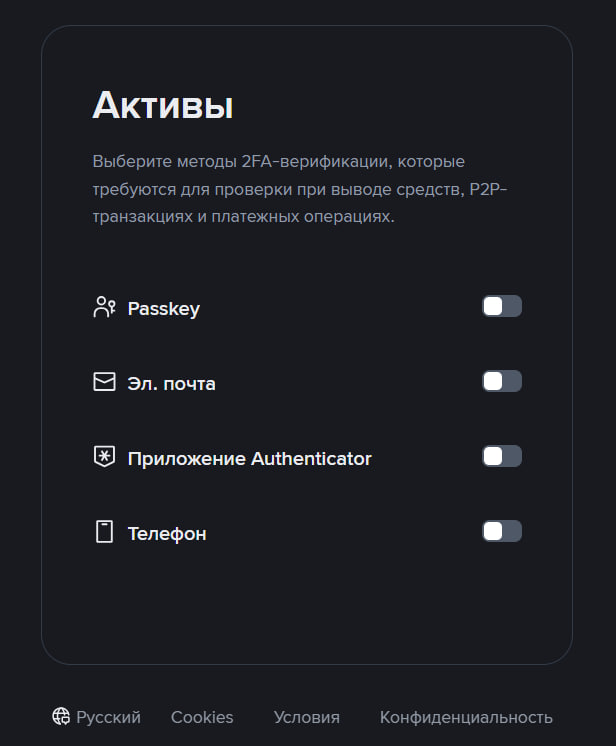 По факту, эта биржа разработала целую 2FA-систему для своих клиентов, где поддерживаются не только настраиваемые методы двухфакторной аутентификации, но и пароли доступа — криптографические ключи, которые надежно хранятся на собственном устройстве пользователя, что существенно затрудняет фишинг и утечку паролей.