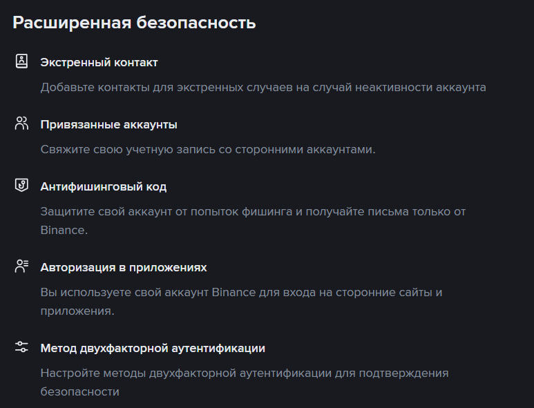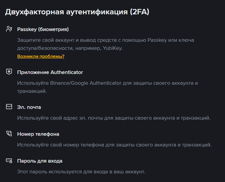 Прямо сейчас, помимо базовых инструментов, на Binance есть биометрическая аутентификация без пароля (passkey), подтверждение по электронной почте с помощью одноразовых кодов, приложения-аутентификаторы, генерирующие временные пароли, антифишинговые коды, SMS-коды.