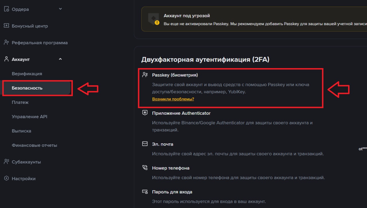 Passkey считается мощнейшим средством защиты пользователей и рекомендуется Binance — для установки этого метода на аккаунт опять же нужно лишь перейти в раздел «Безопасность» и выбрать «Биометрию» в топе предлагаемых инструментов.