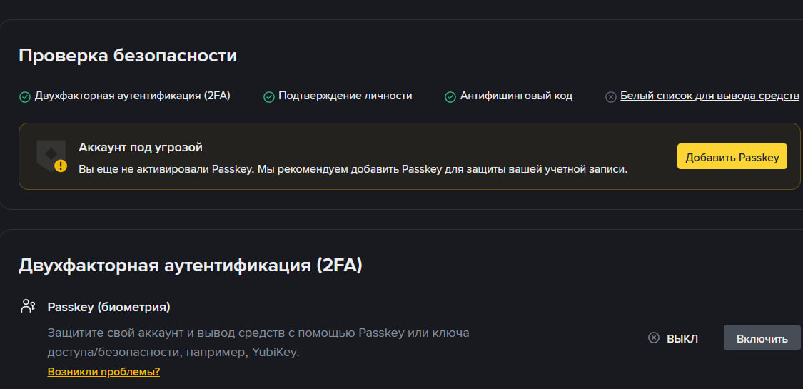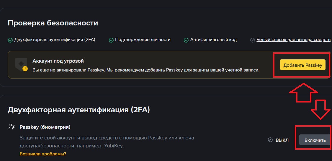 Для активации биометрии на Binance достаточно нажать «Включить» или «Добавить Passkey».